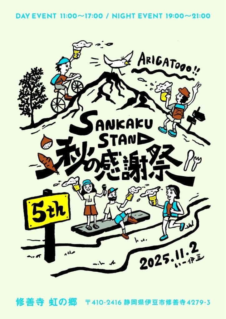 2025年11月2日修善寺虹の郷にて開催される、伊豆の人気アウトドアショップ『SANKAKU STAND』さんの秋の感謝祭。